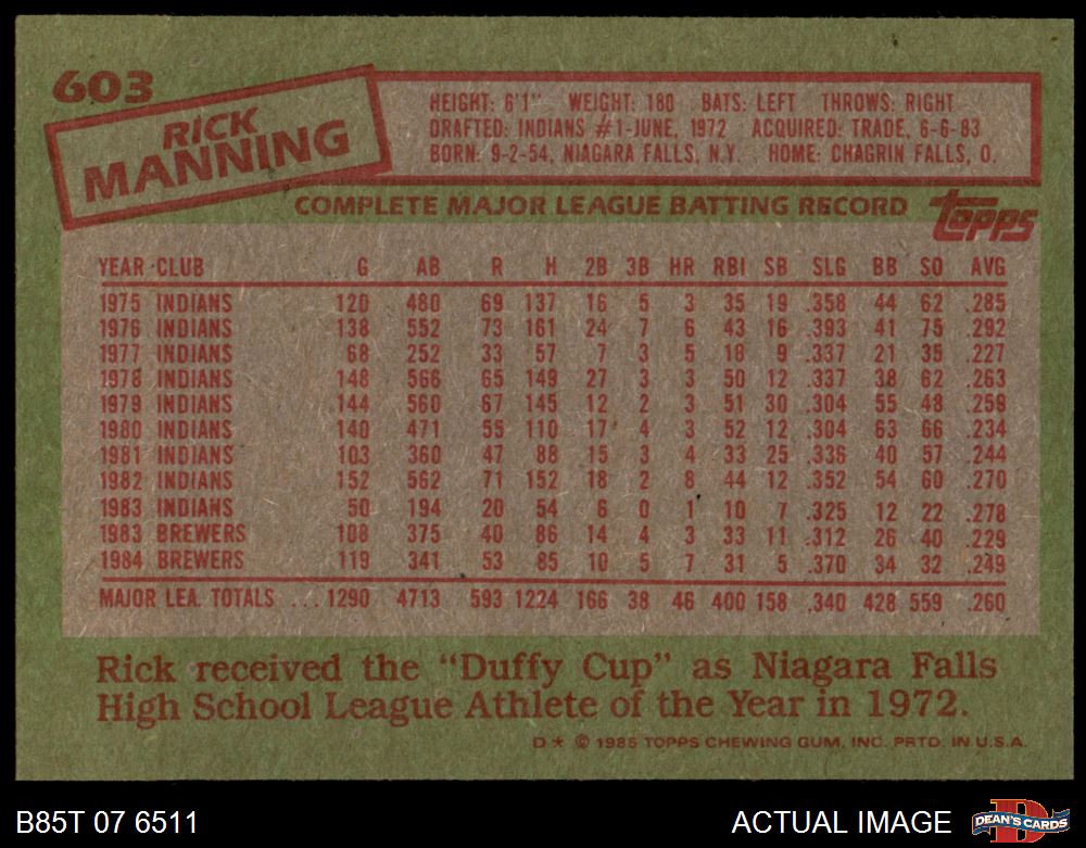 1985 Topps #603 Rick Manning 7 - NM