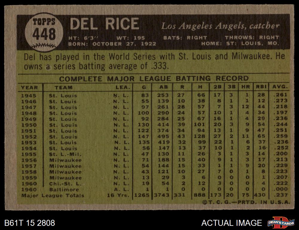 1961 Topps #448 Del Rice 4 - VG/EX