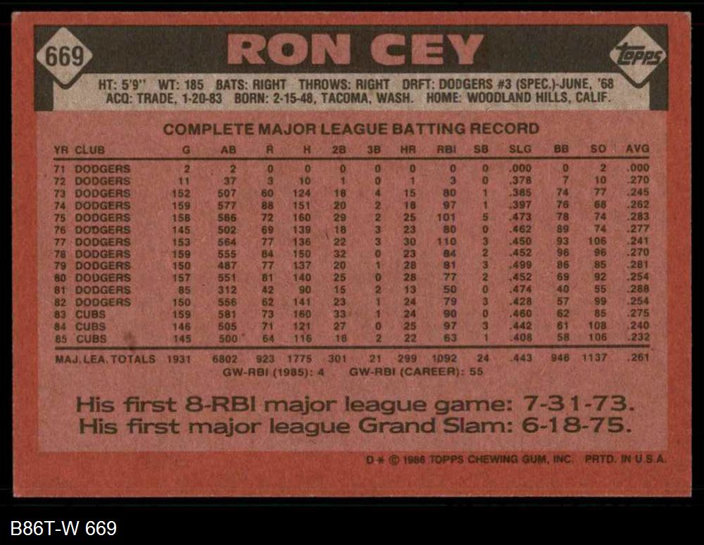 1986 Topps #669 Ron Cey