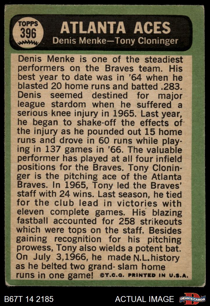1967 Topps #396 - Denis Menke / Tony Cloninger Atlanta Aces 1 - POOR