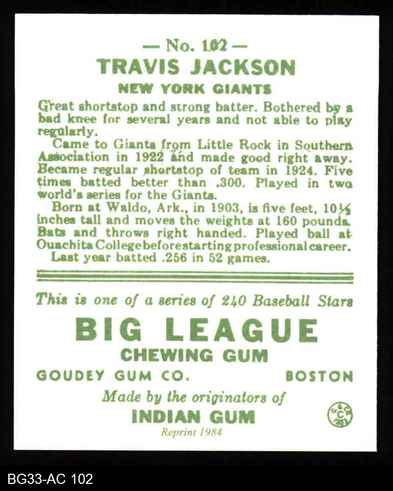 1933 Goudey Reprint #102 Travis 'Stonewall' Jackson 8 - NM/MT