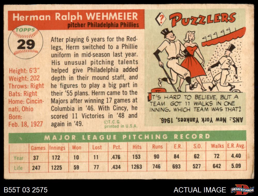 1955 Topps #29 Herm Wehmeier 3 - VG