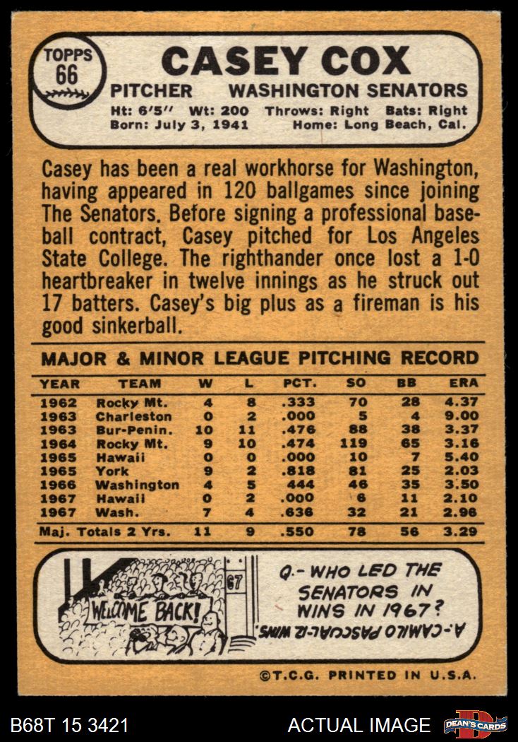 1968 Topps #66 A Casey Cox