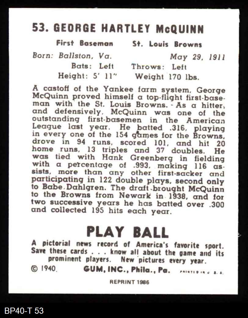 1940 Play Ball Reprint #53 George McQuinn 8 - NM/MT