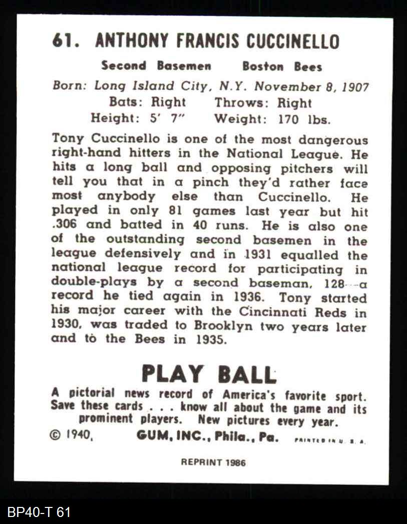 1940 Play Ball Reprint #61 Tony Cuccinello 8 - NM/MT