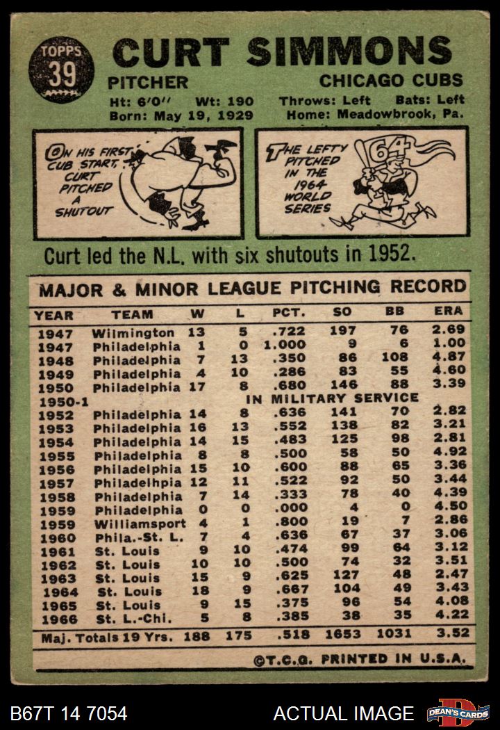 1967 Topps #39 Curt Simmons 3 - VG