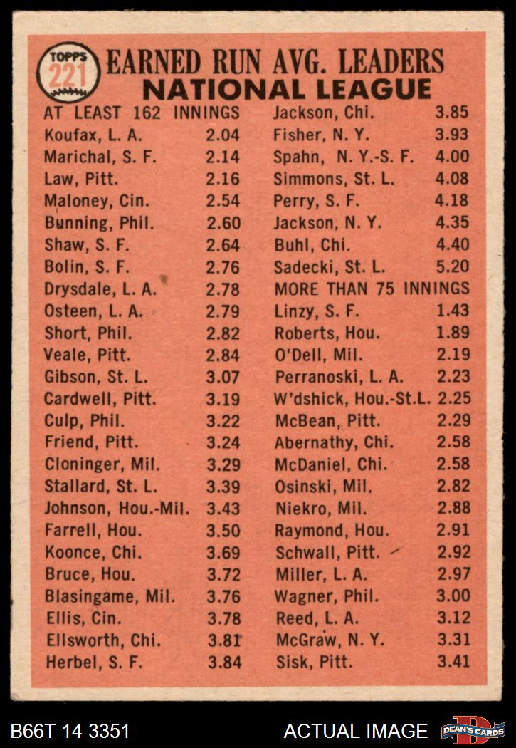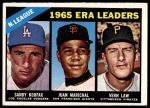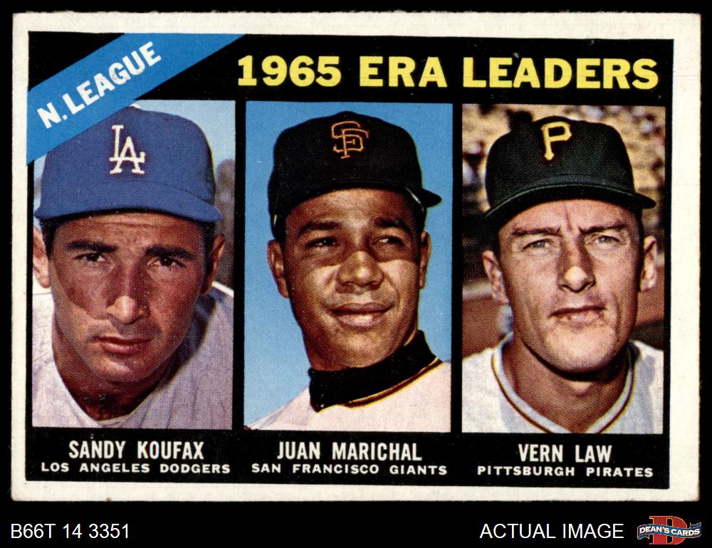 1966 Topps #221 - Sandy Koufax / Juan Marichal / Vern Law NL ERA Leaders 4 - VG/EX