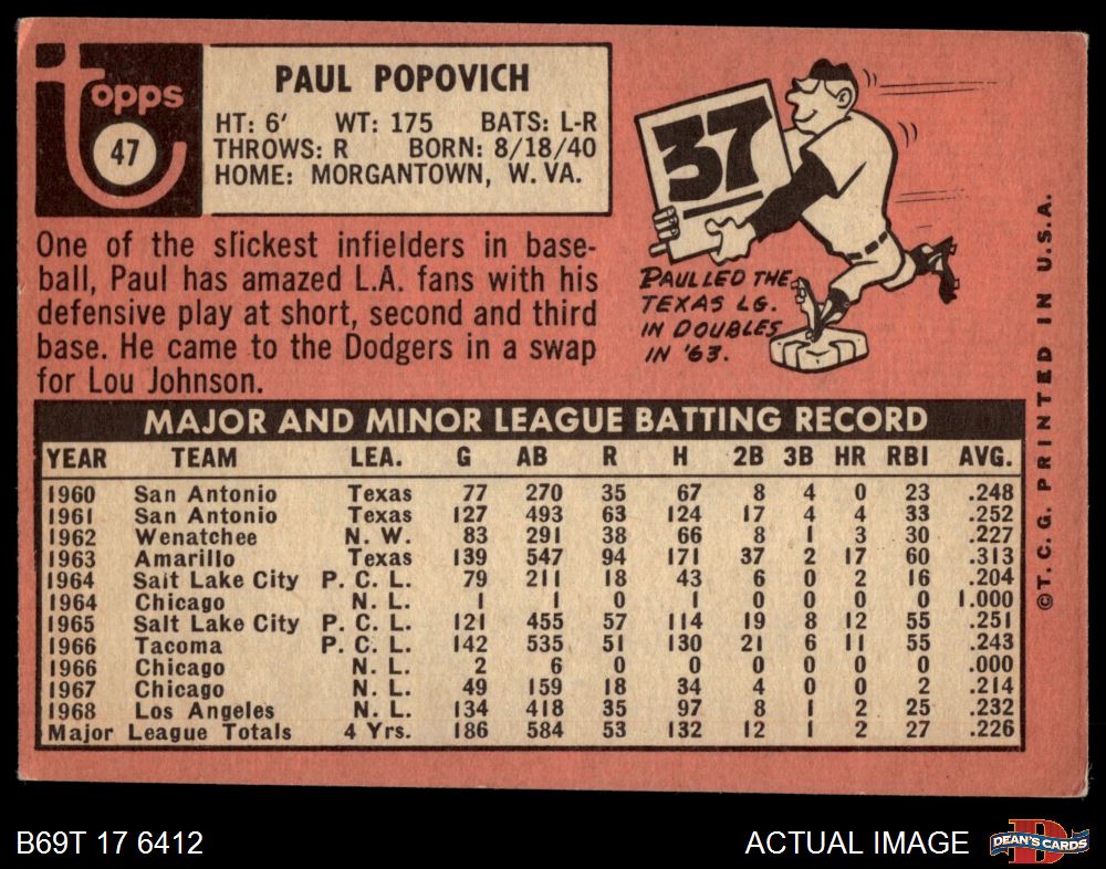 1969 Topps #47 A Paul Popovich 3 - VG