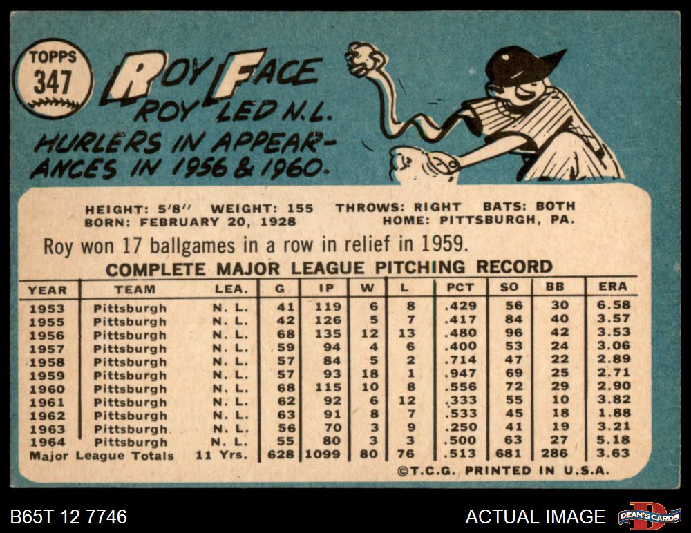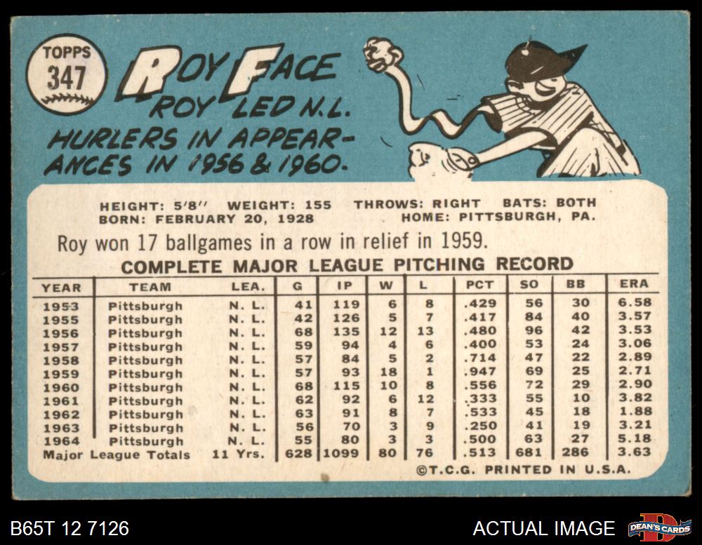 1965 Topps #347 Roy Face 3 - VG