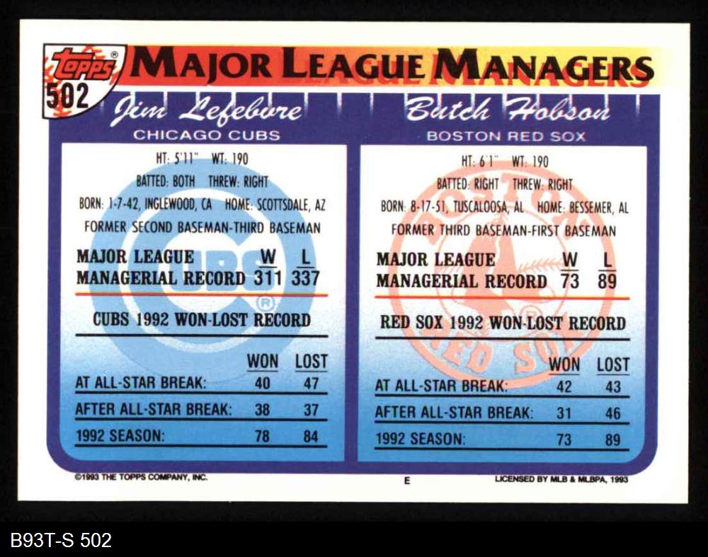 1993 Topps #502 - Butch Hobson / Jim Lefebvre Managers 8 - NM/MT