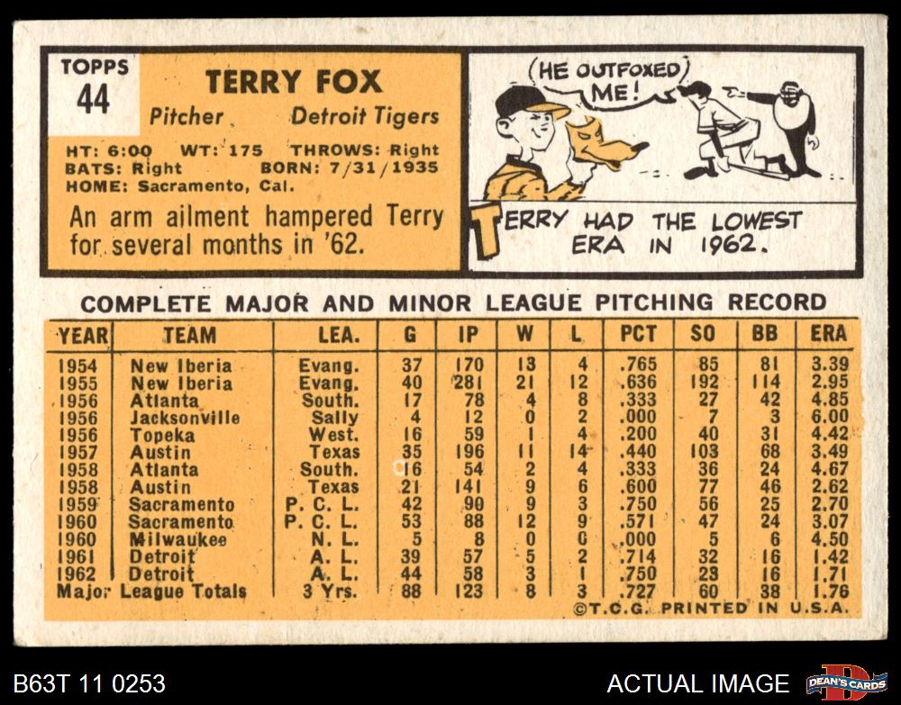 1963 Topps #44 Terry Fox 3 - VG