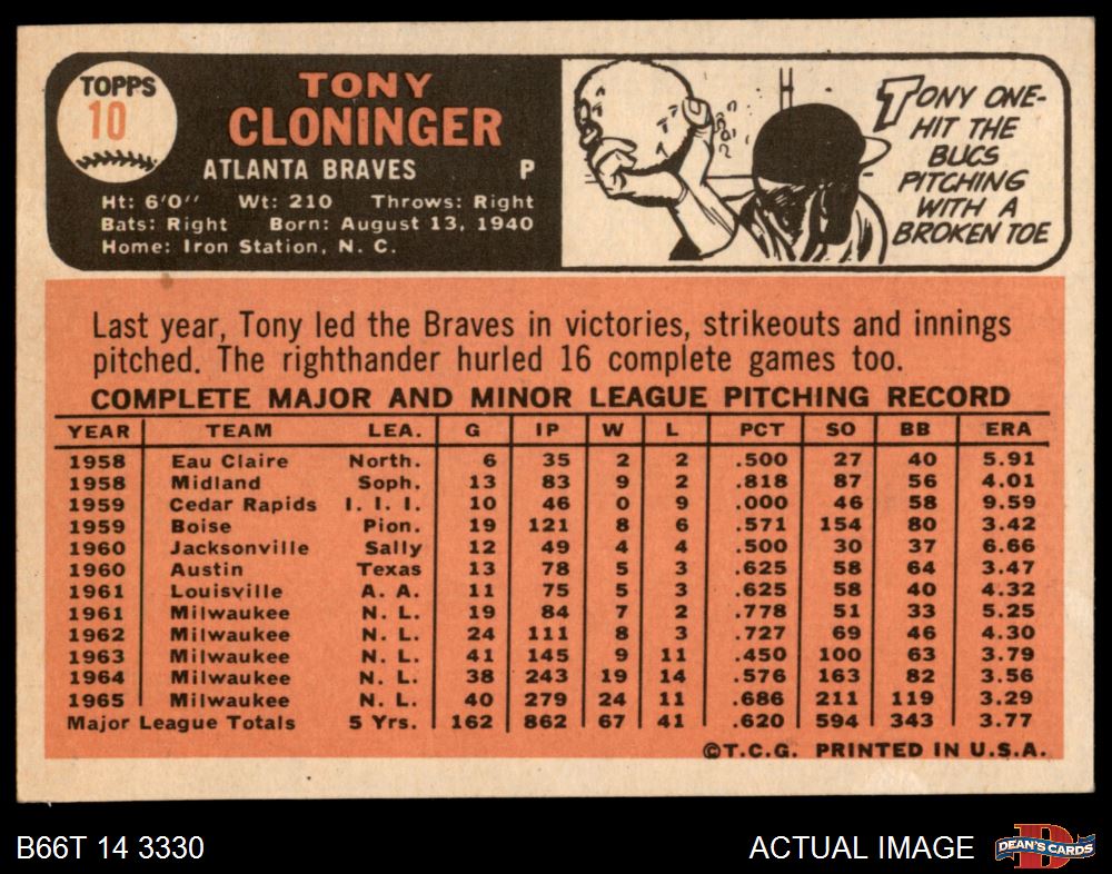 1966 Topps #10 Tony Cloninger 6 - EX/MT
