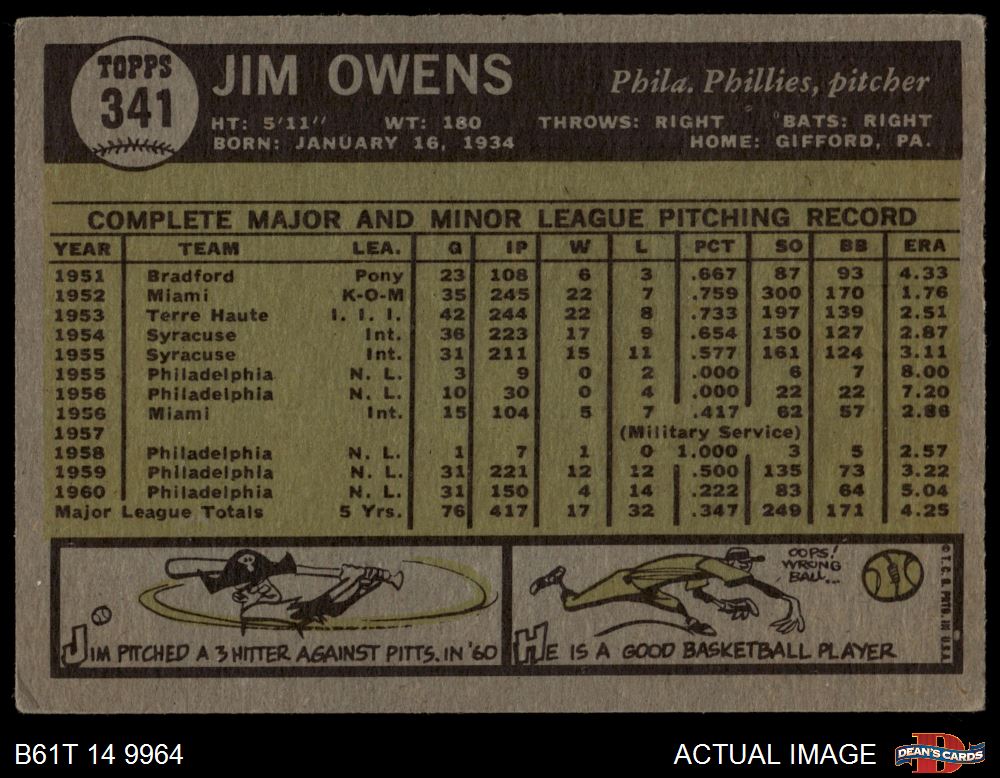 1961 Topps #341 Jim Owens 3 - VG