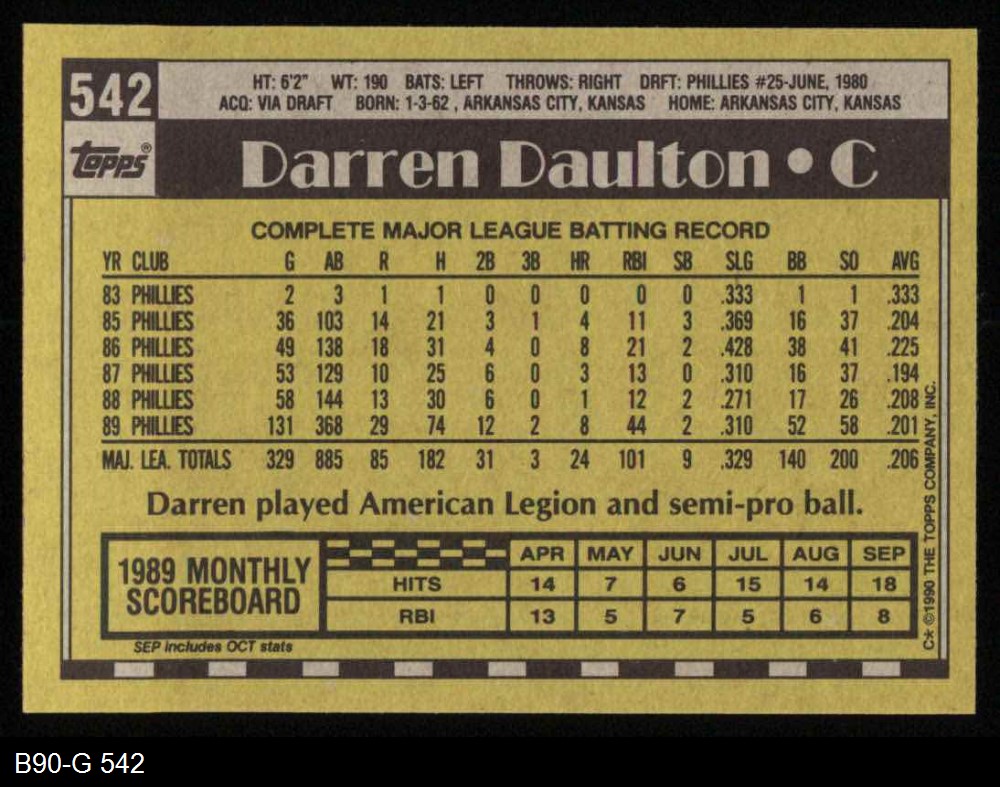 1990 Topps #542 Darren Daulton 8 - NM/MT