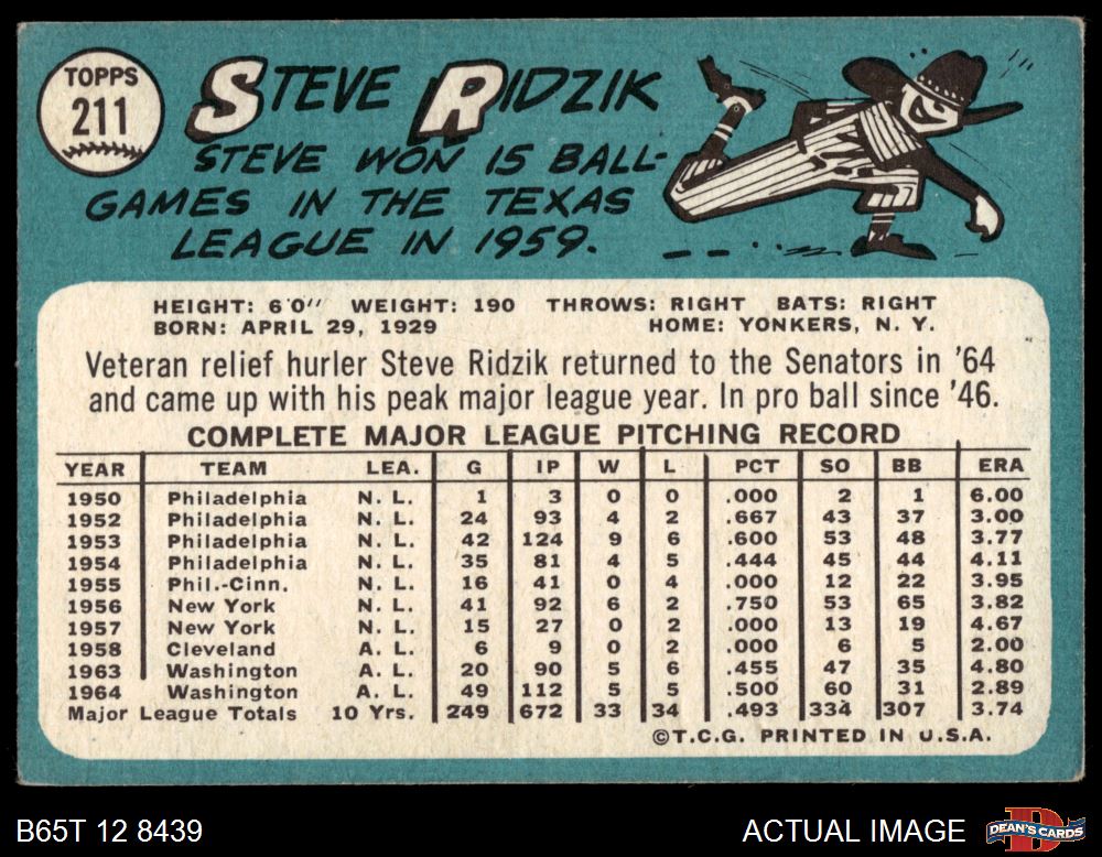 1965 Topps #211 Steve Ridzik 3 - VG