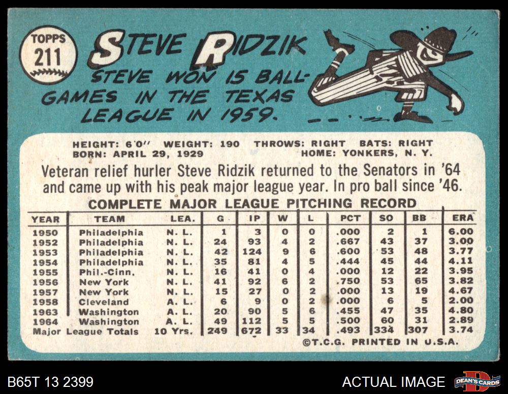 1965 Topps #211 Steve Ridzik 4 - VG/EX