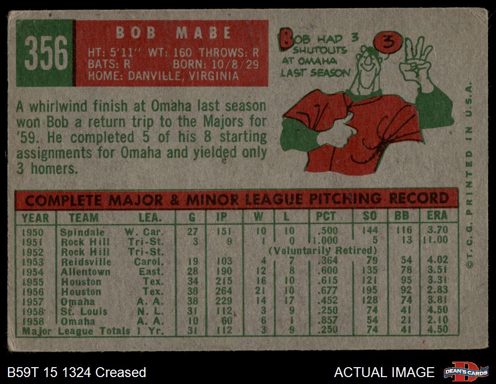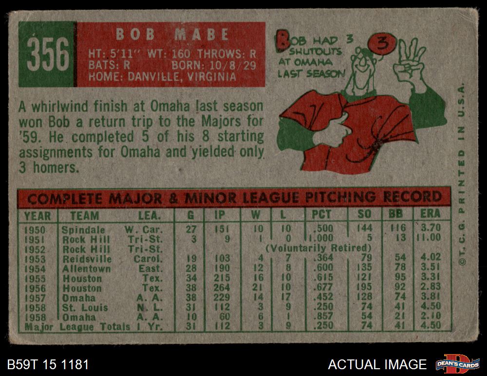 1959 Topps #356 Bob Mabe 2 - GOOD