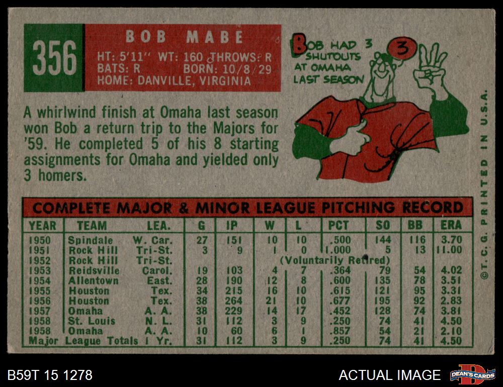 1959 Topps #356 Bob Mabe 3 - VG