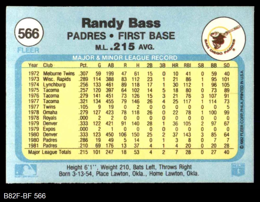 1982 Fleer #566 Randy Bass 8 - NM/MT