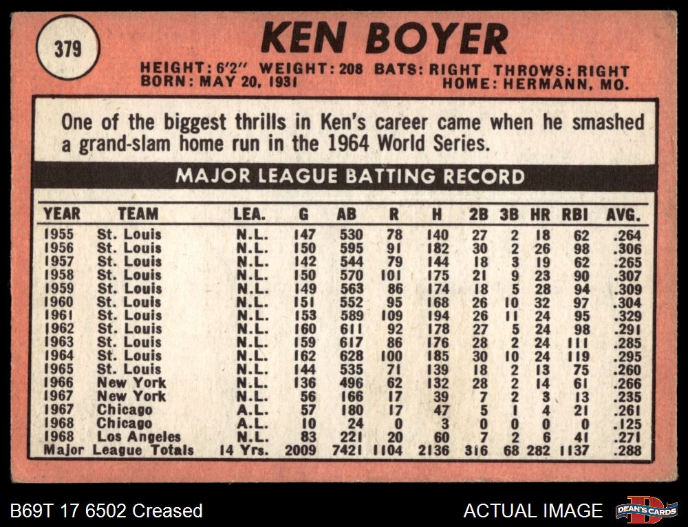 1969 Topps #379 Ken Boyer 2 - GOOD