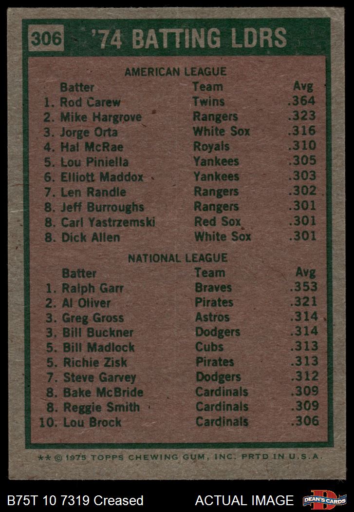 1975 Topps #306  -  Rod Carew / Ralph Garr Batting Leaders Front Thumbnail