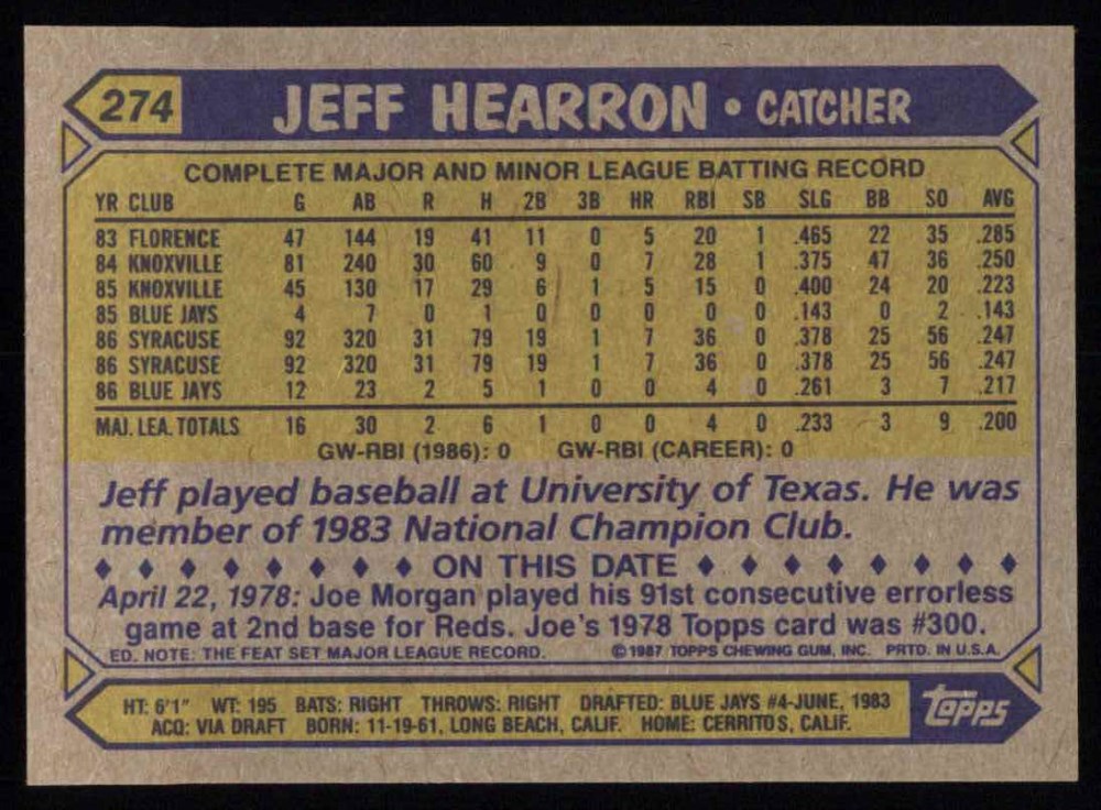 1987 Topps #274 Jeff Hearron 8 - NM/MT