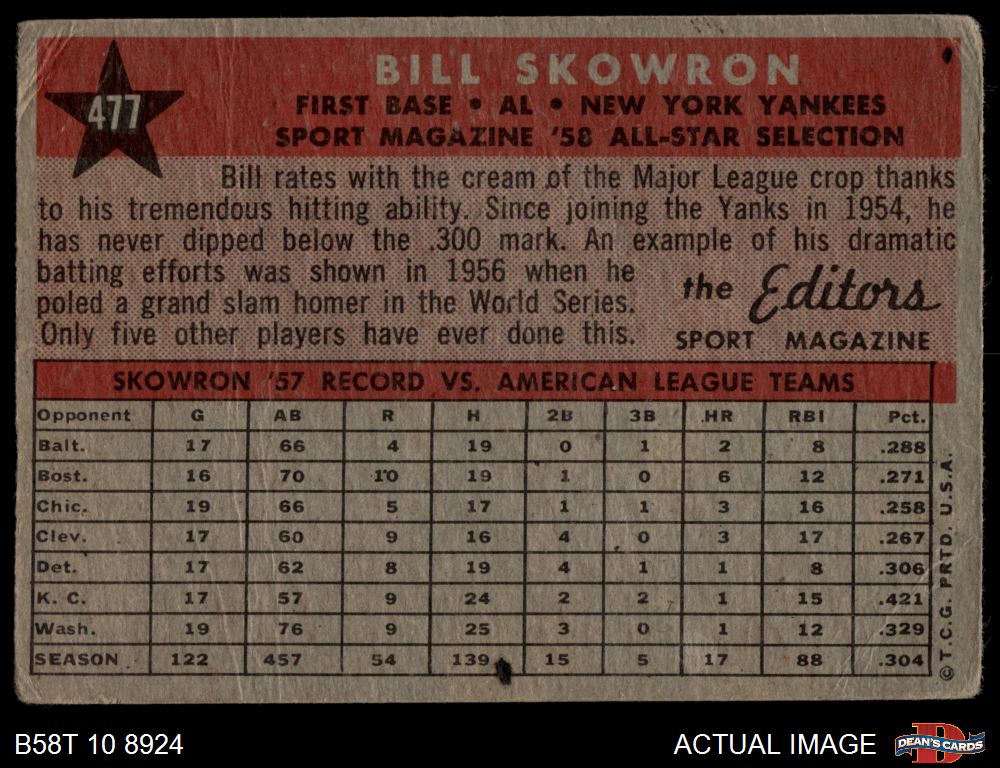 1958 Topps #477 - Bill Skowron All-Star 1 - POOR
