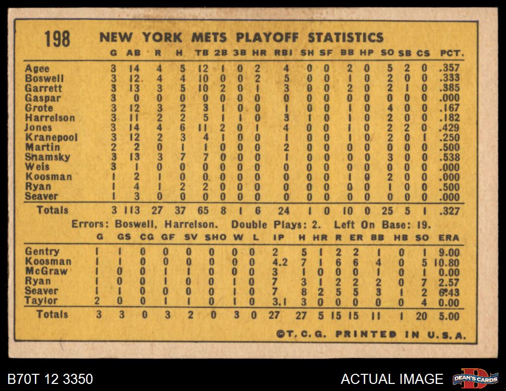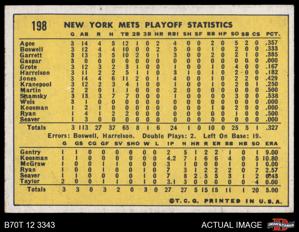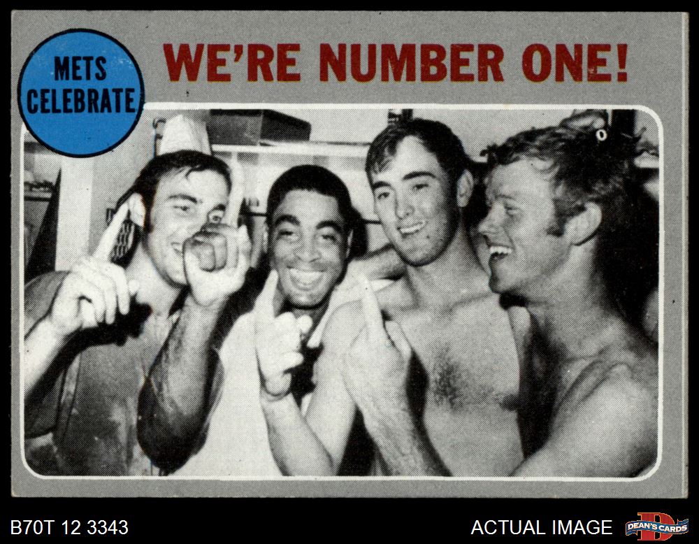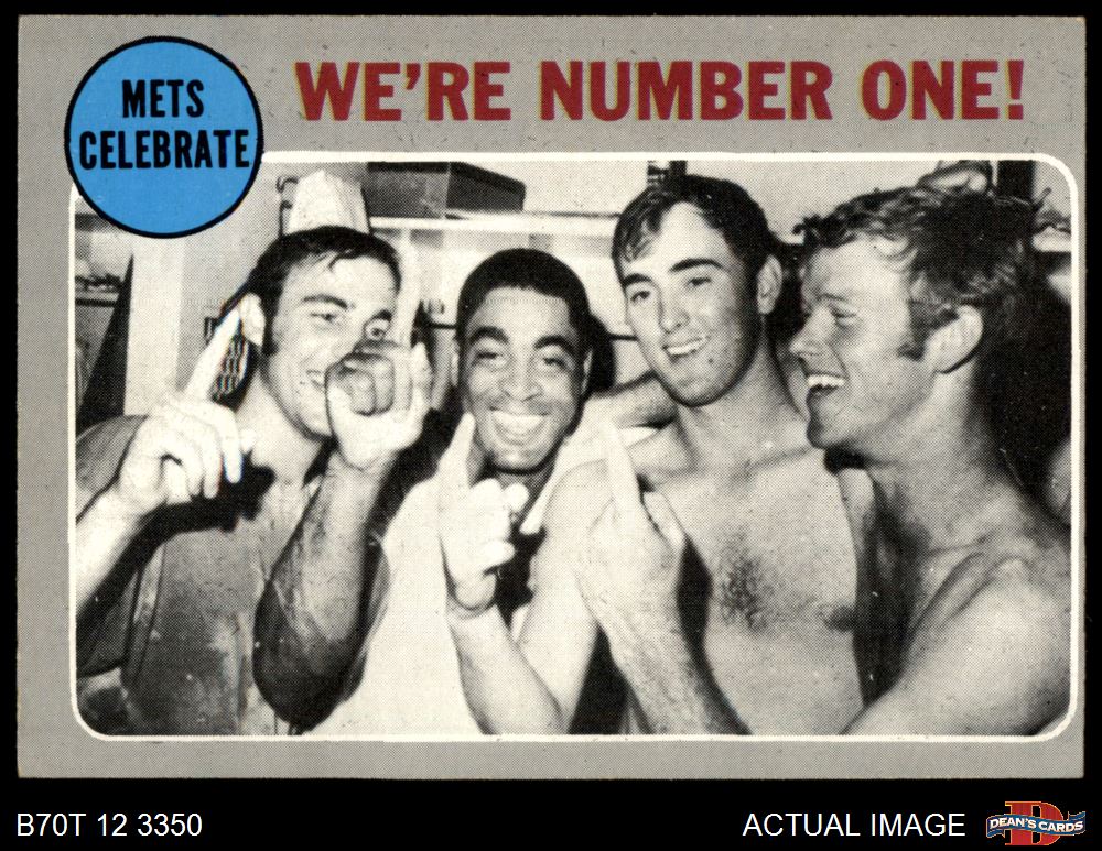 1970 Topps #198 Nolan Ryan / Tommie Agee / Duffy Dyer 1969 NL Playoff - Summary - Mets Celebrate 4 - VG/EX