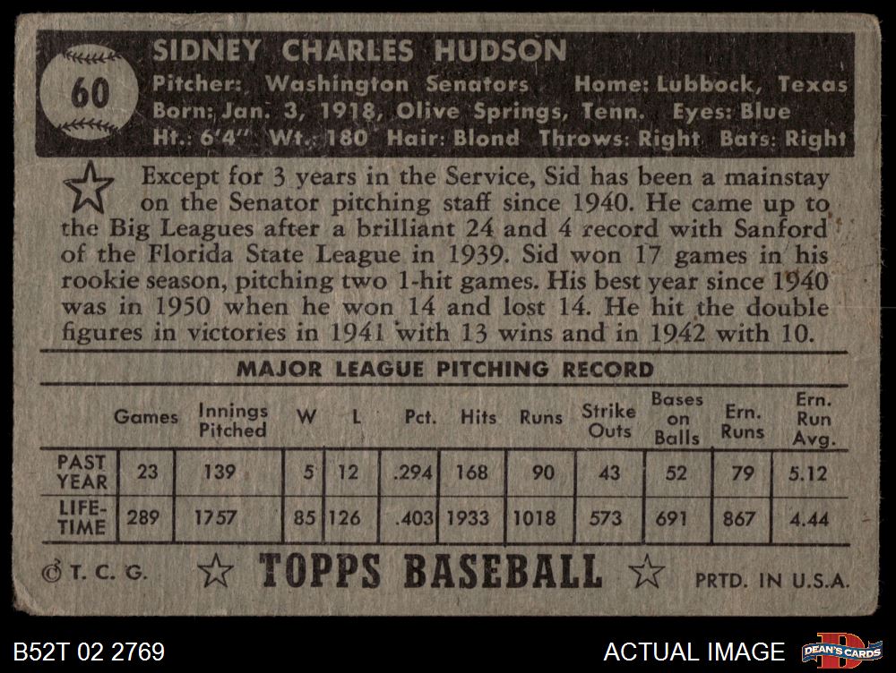 1952 Topps #60 Sid Hudson 1 - POOR