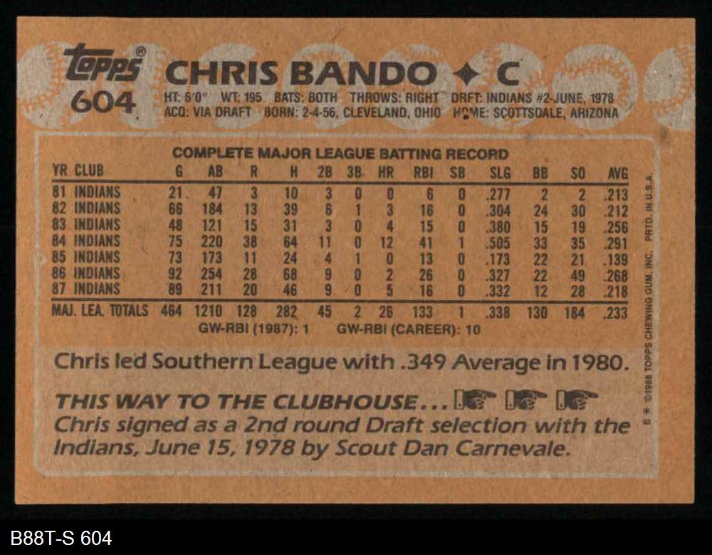 1988 Topps #604 Chris Bando 8 - NM/MT