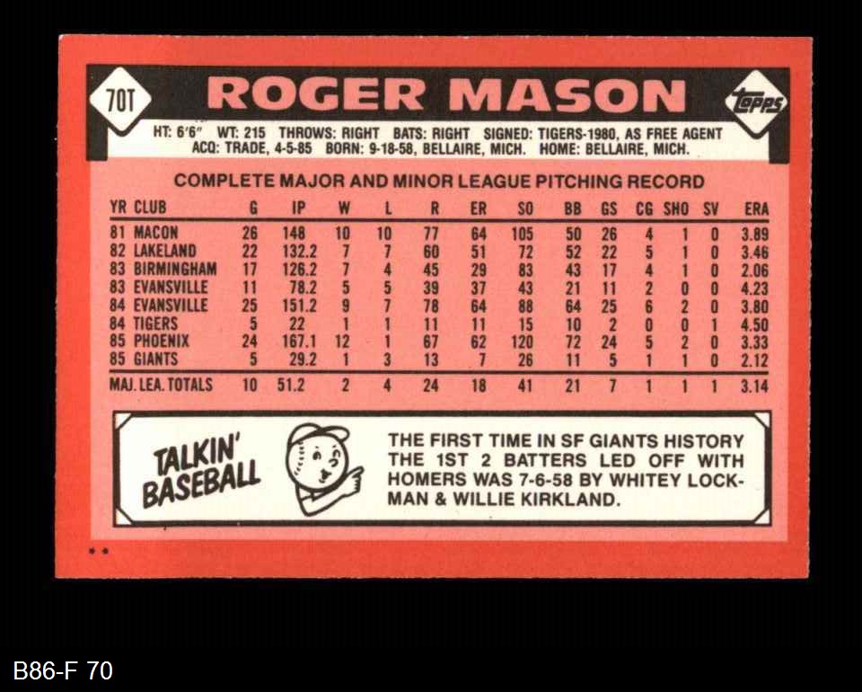 1986 Topps Traded #70 T Roger Mason 8 - NM/MT