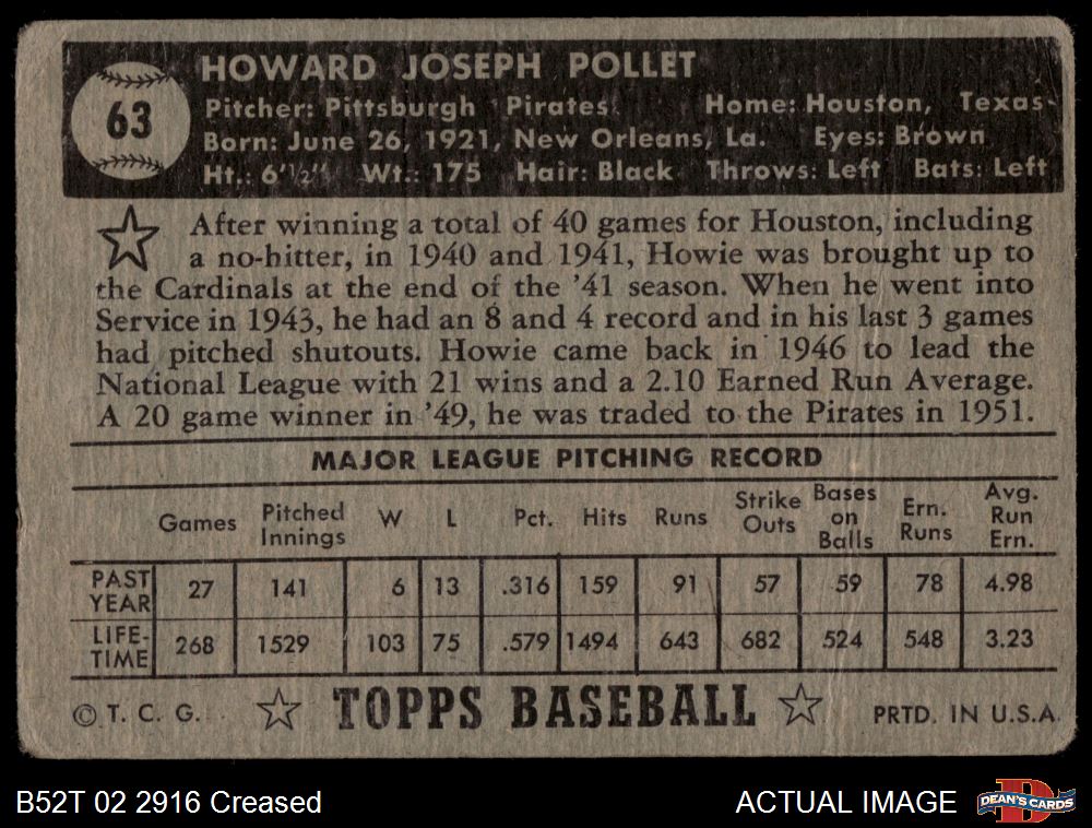1952 Topps #63 Howie Pollet Front Thumbnail