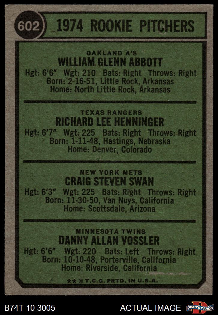 1974 Topps #602 - Craig Swan / Glenn Abbott / Rick Henninger / Dan Vossler Rookie Pitchers 5 - EX