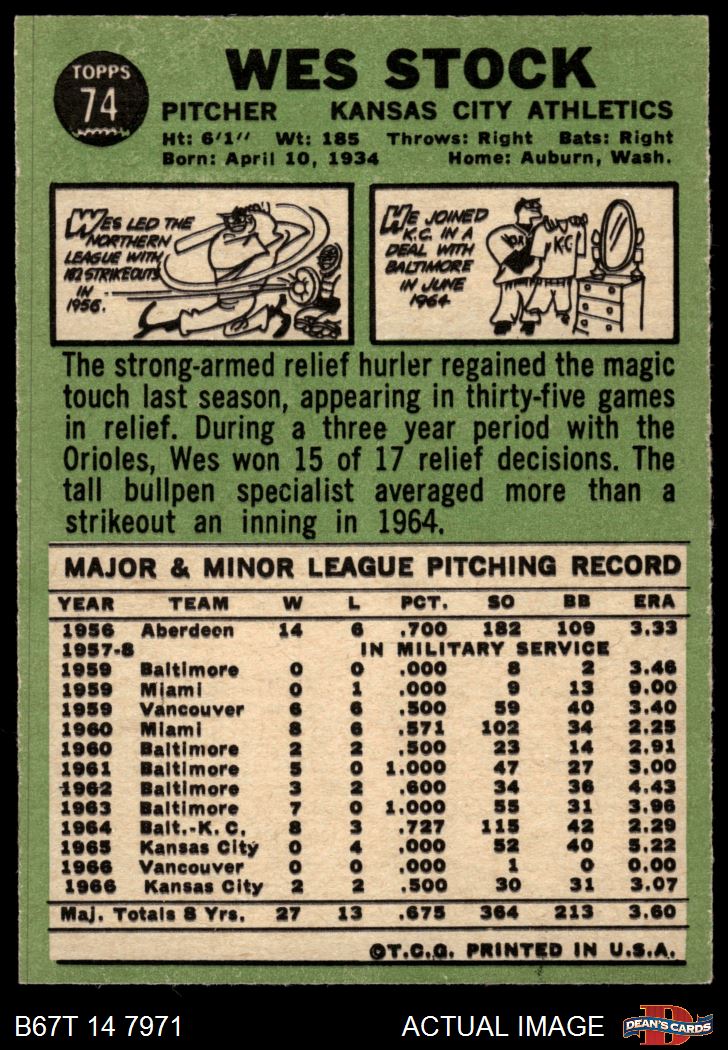 1967 Topps #74 Wes Stock 5.5 - EX+
