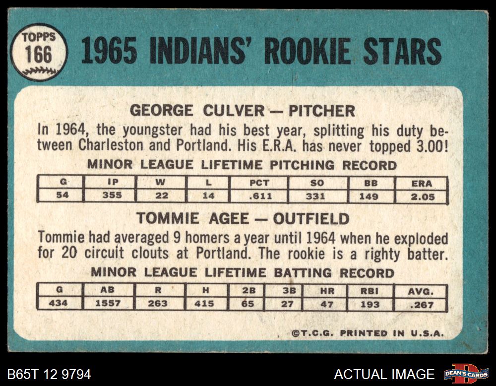1965 Topps #166 - Tommie Agee / George Culver Indians Rookies 3 - VG