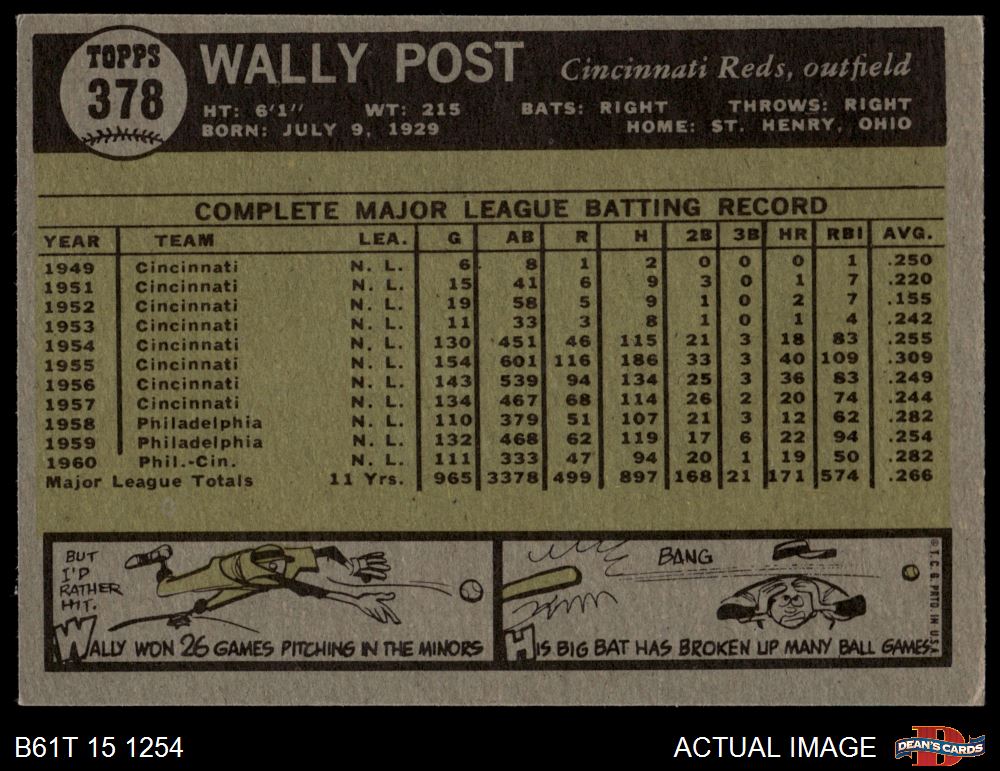 1961 Topps #378 Wally Post 3 - VG