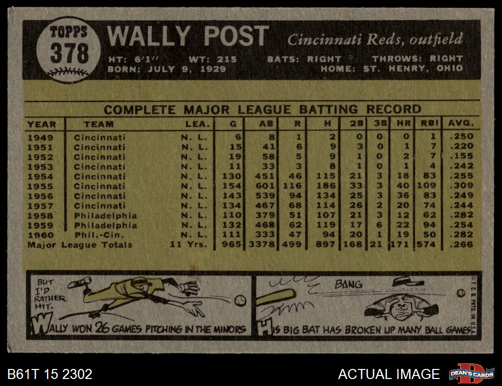 1961 Topps #378 Wally Post 5.5 - EX+