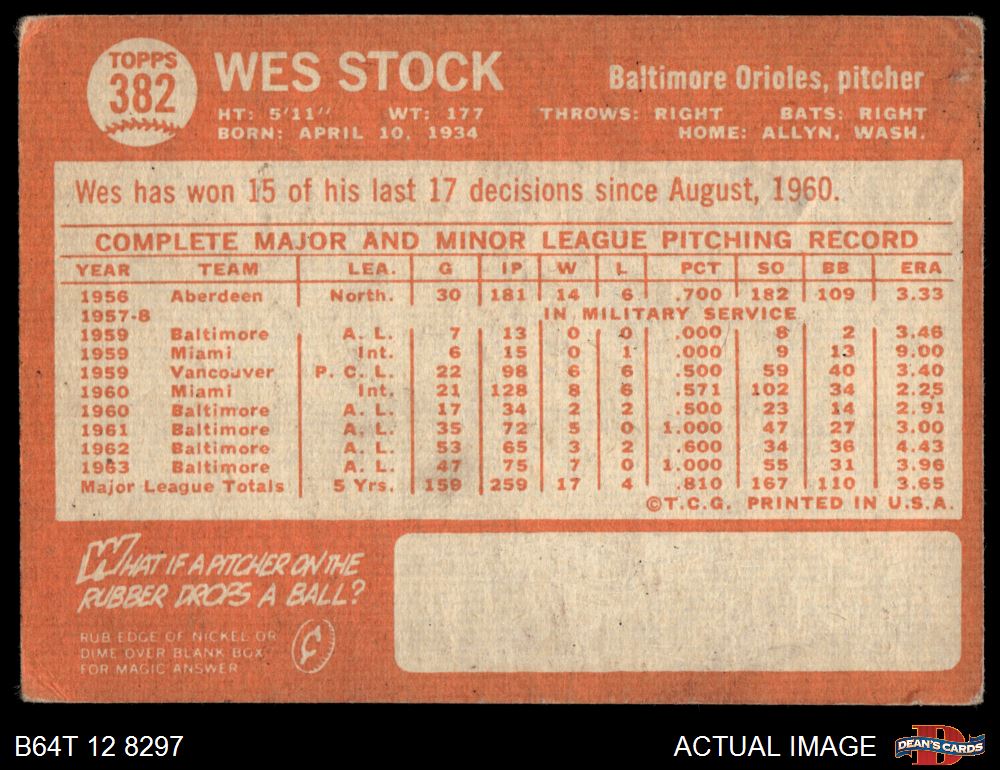 1964 Topps #382 Wes Stock 2.5 - GD+