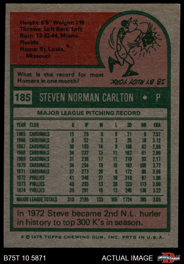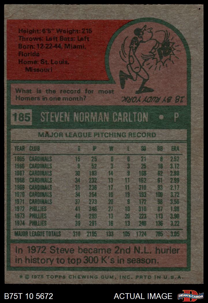 1975 Topps #185 Steve Carlton 6 - EX/MT