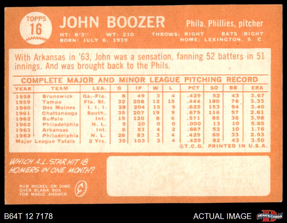 1964 Topps #16 John Boozer 3 - VG