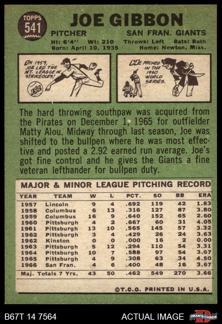 1967 Topps #541 Joe Gibbon 7 - NM