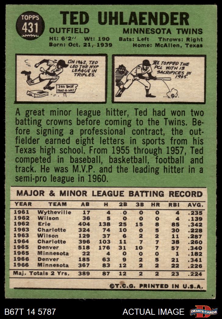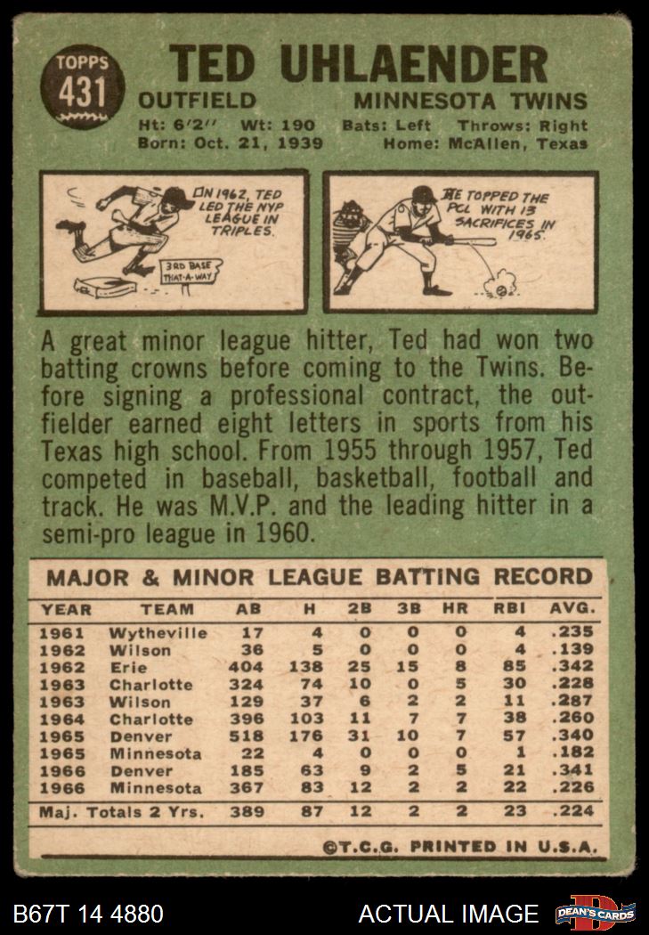 1967 Topps #431 Ted Uhlaender 2 - GOOD