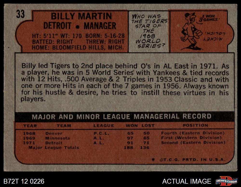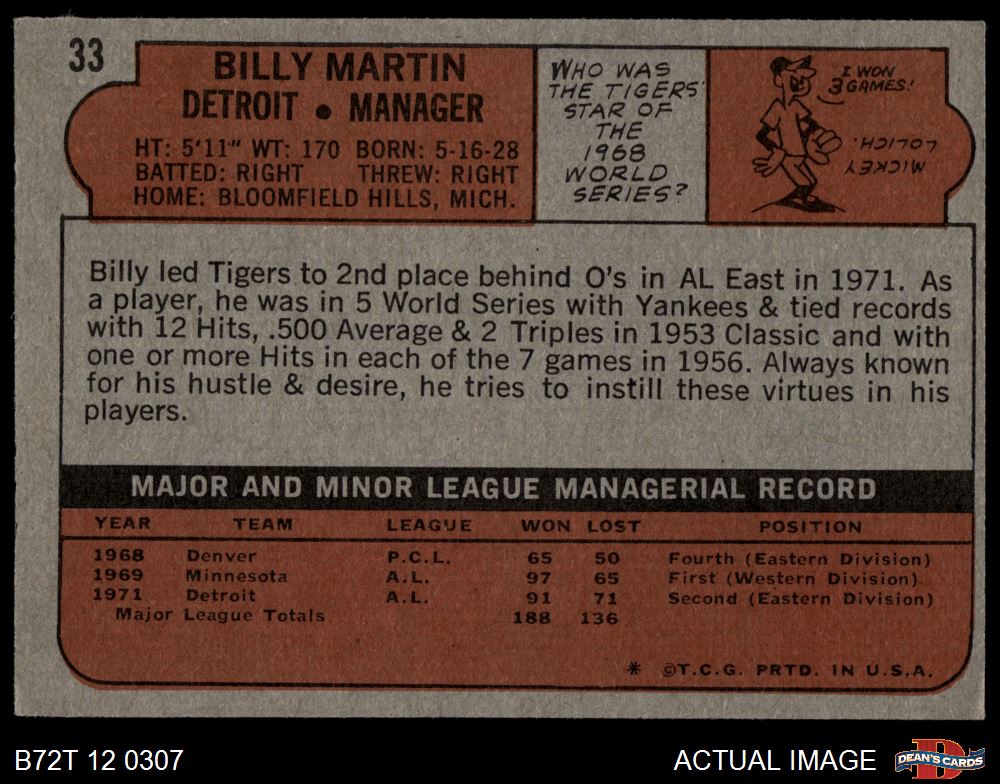 1972 Topps #33 Billy Martin 3 - VG