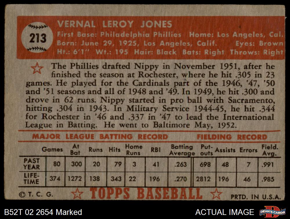 1952 Topps #213 Vernal 'Nippy' Jones 1.5 - FAIR