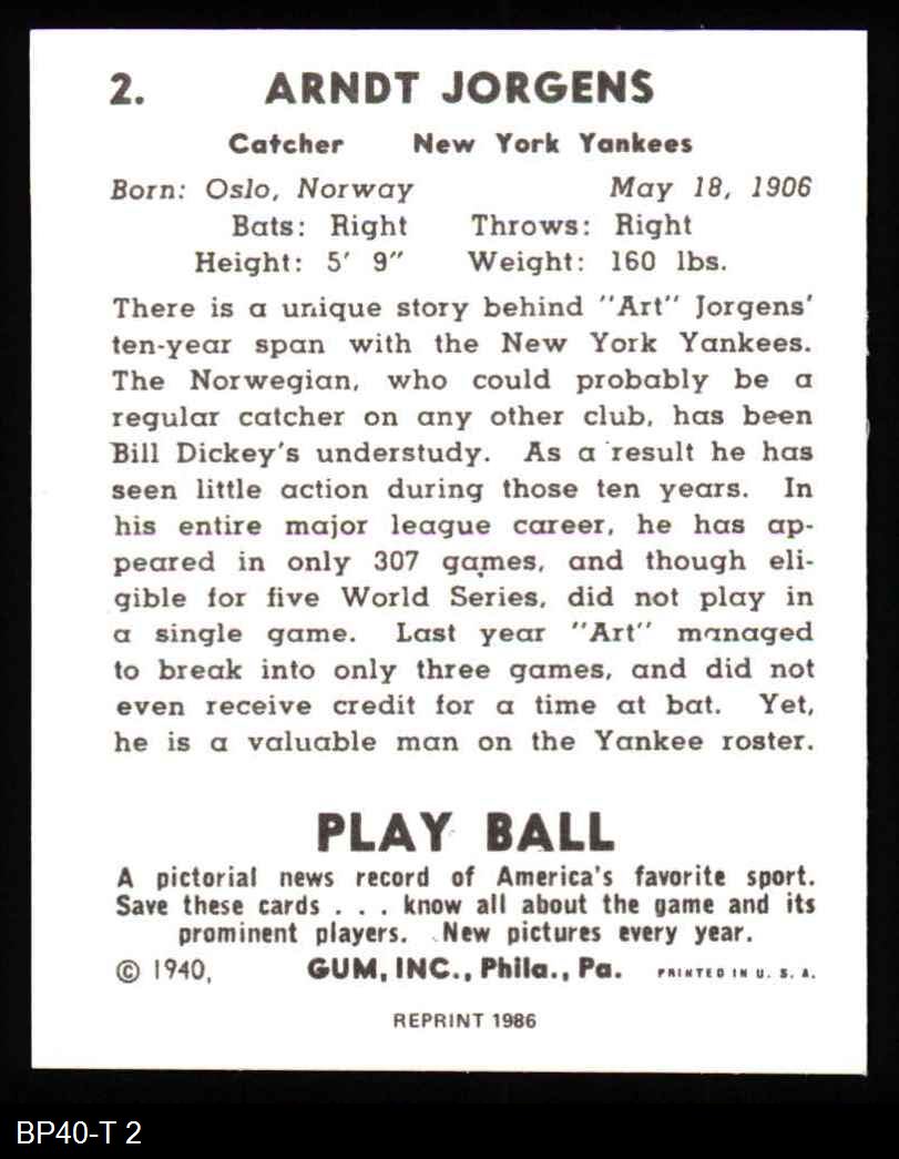 1940 Play Ball Reprint #2 Art Jorgens 8 - NM/MT
