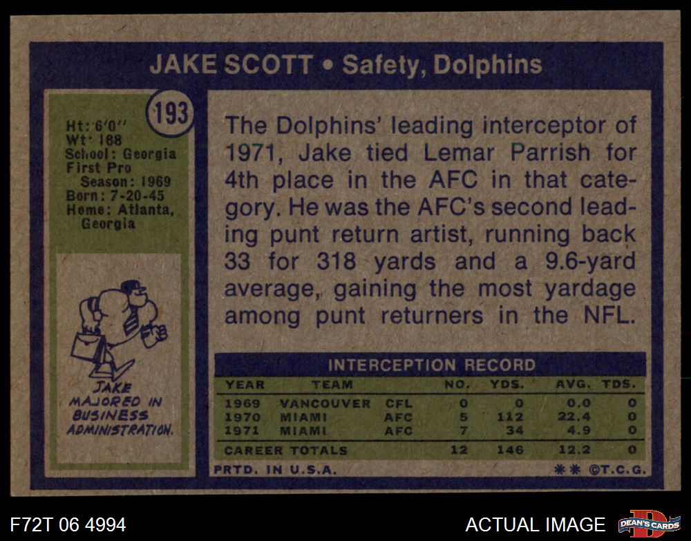 1972 Topps #193 Jake Scott 4 - VG/EX