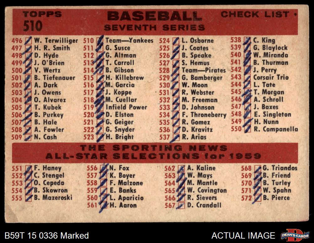 1959 Topps #510 Yankees Team Checklist 1.5 - FAIR