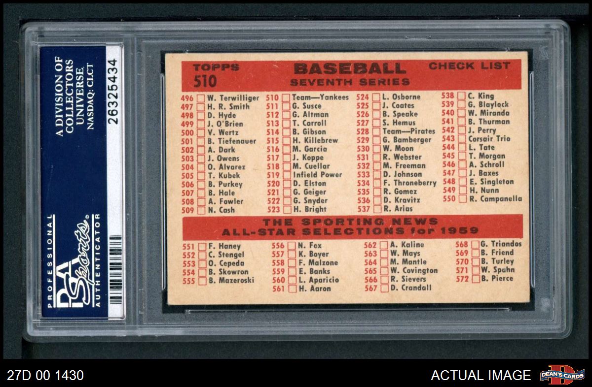 1959 Topps #510 Yankees Team Checklist PSA 6 - EX/MT