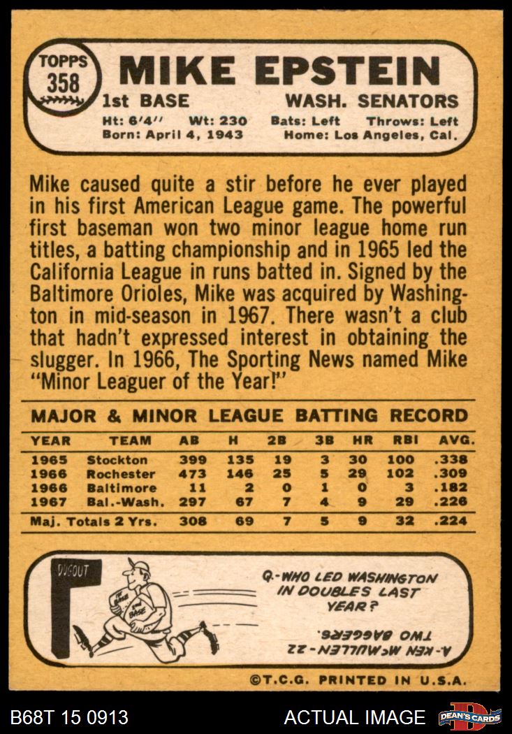 1968 Topps #358 Mike Epstein 6 - EX/MT