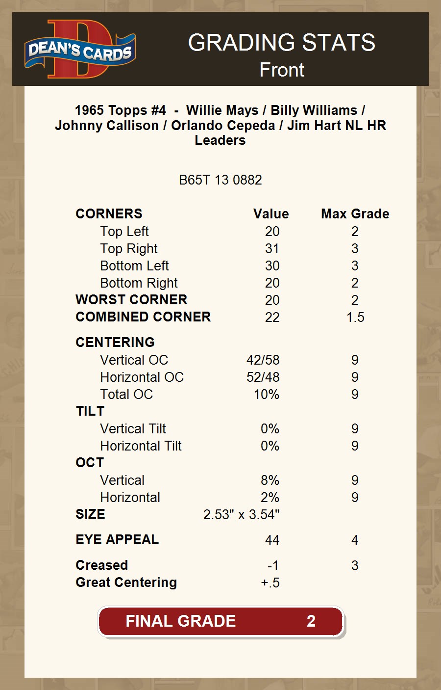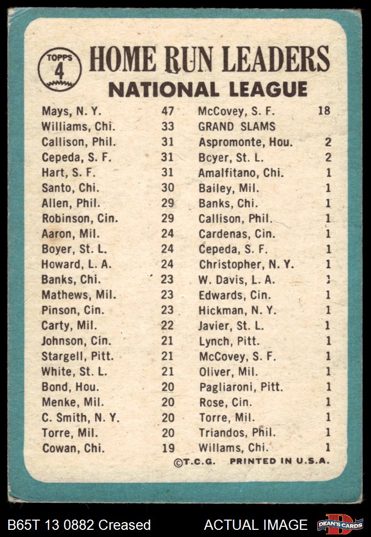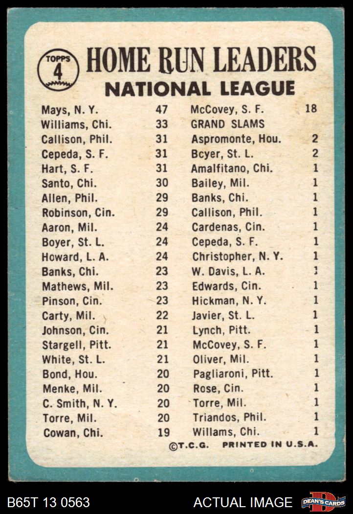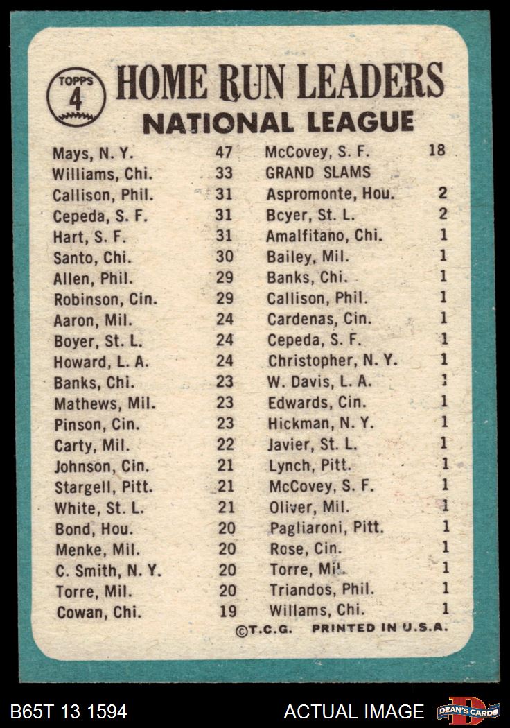 1965 Topps #4 - Willie Mays / Billy Williams / Johnny Callison / Orlando Cepeda / Jim Hart NL HR Leaders 2 - GOOD